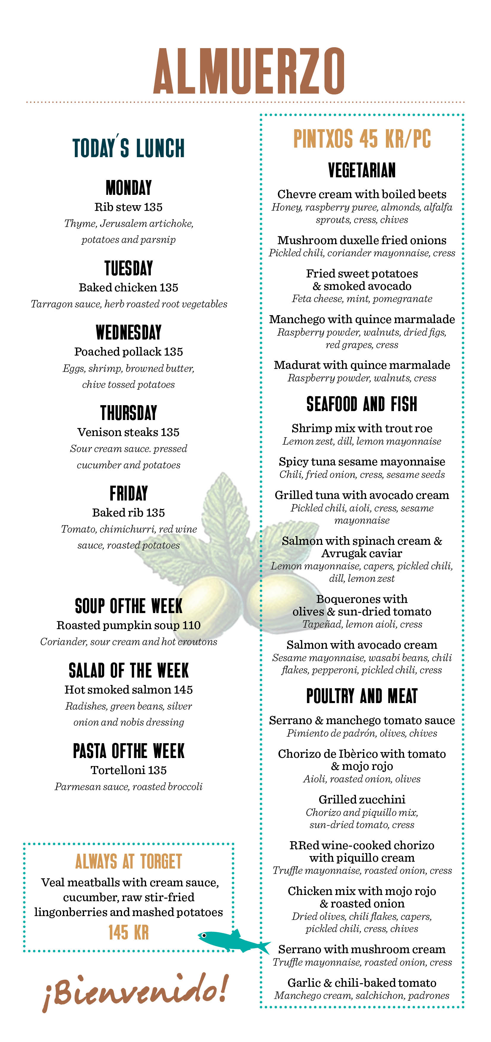 We serve our lunches at Boqueria from Monday to Friday with flavors from all over the world. You can choose from a variety of tapas, the fish of the week, and the vegetable dish of the week. We change our menu weekly and always try to work with the best ingredients available at the moment. Come and try it!